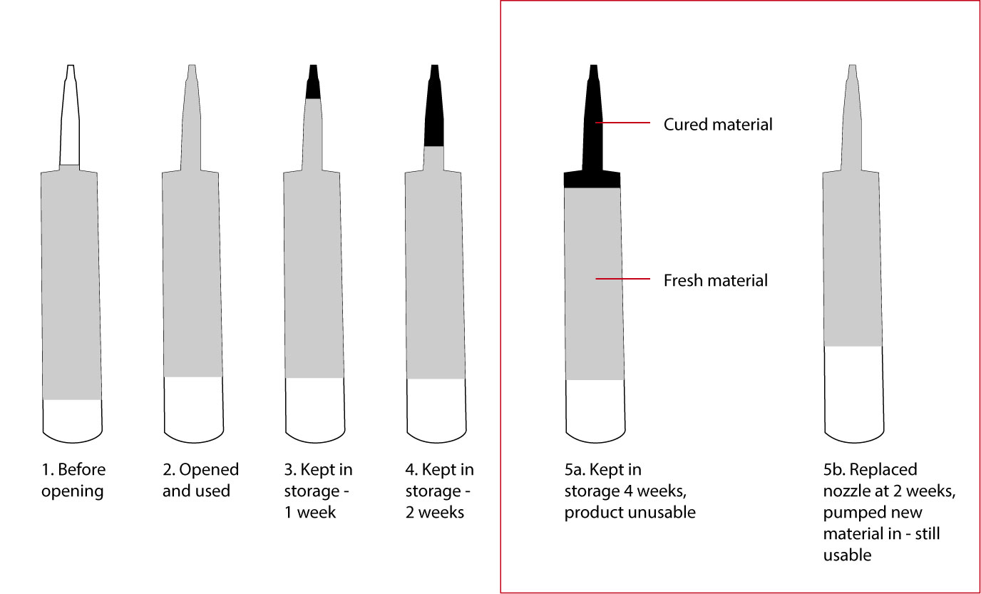 5. a. If the nozzle is not replaced, the sealant will continue curing downwards into the cartridge body itself. At this point in time, you can no longer use the cartridge. However, if you had replaced the nozzle as in 5.b., the cycle can now start again.
