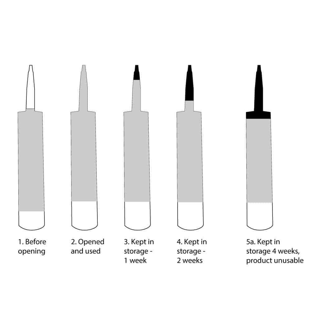 5. a. If the nozzle is not replaced, the sealant will continue curing downwards into the cartridge body itself. At this point in time, you can no longer use the cartridge. However, if you had replaced the nozzle as in 5.b., the cycle can now start again.
